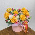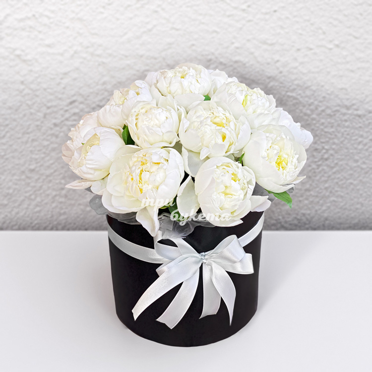 17 белых пионов в шляпной коробке