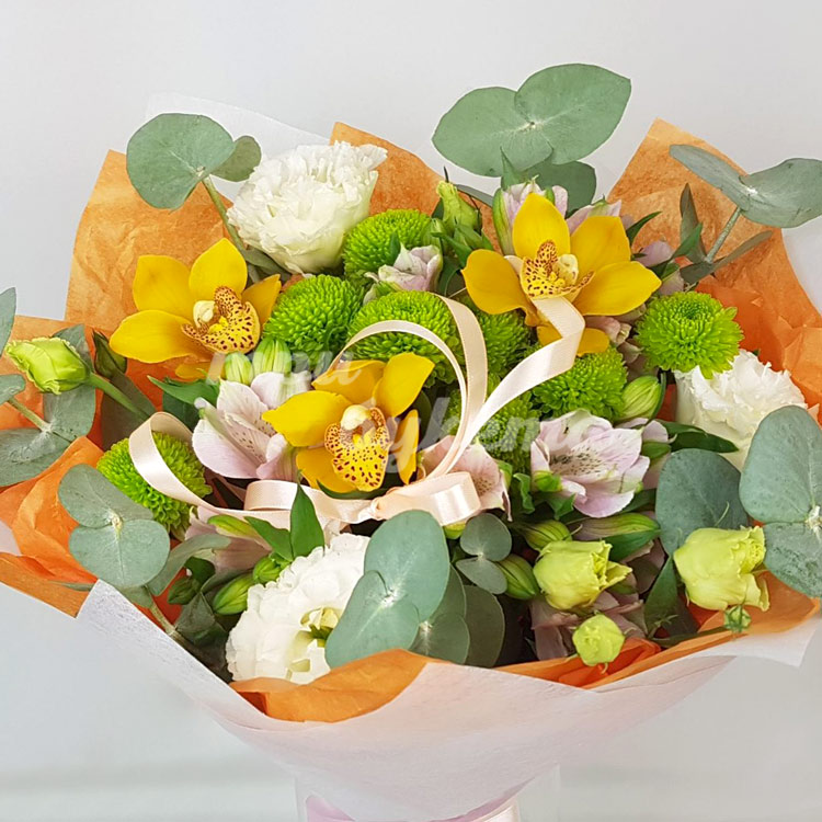 Букет орхидей, хризантем и эустом