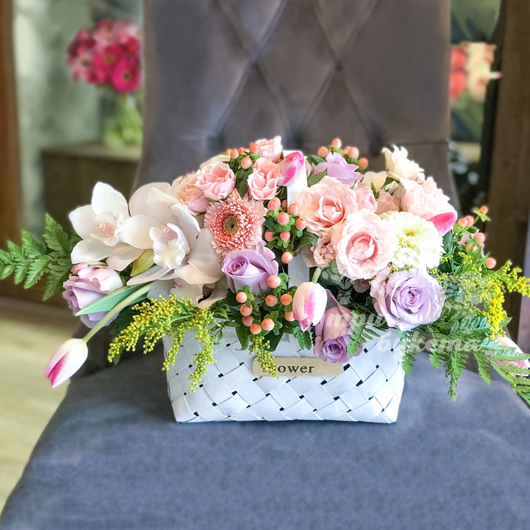 Корзина кустовых роз и тюльпанов