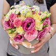 Пурпурные розы с гиперикумом в коробке