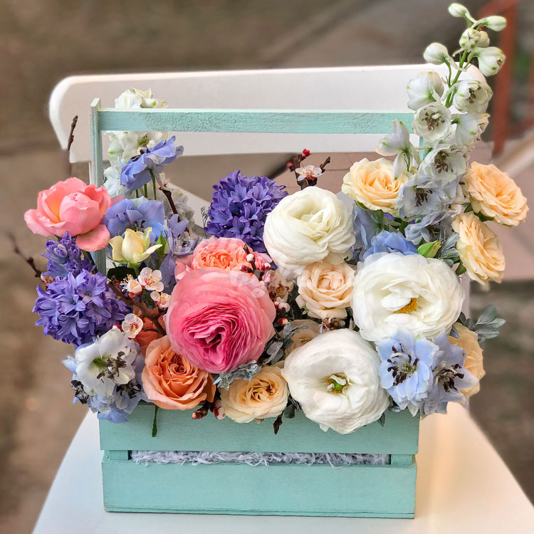 Ранункулюсы и кустовые розы в ящике