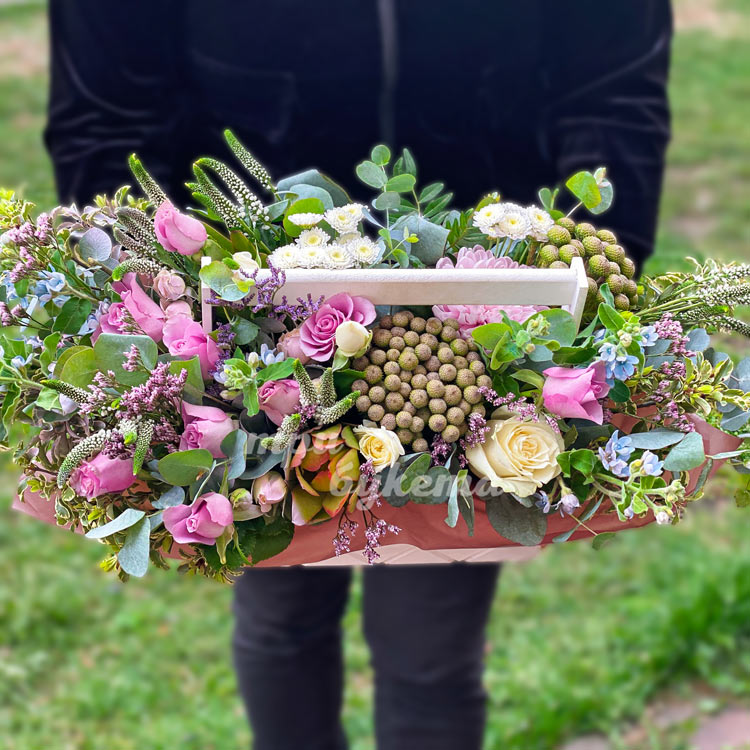 Розы, бруния и оксипеталум в ящике