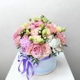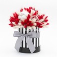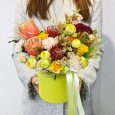 Шляпная коробка белых и желтых хризантем