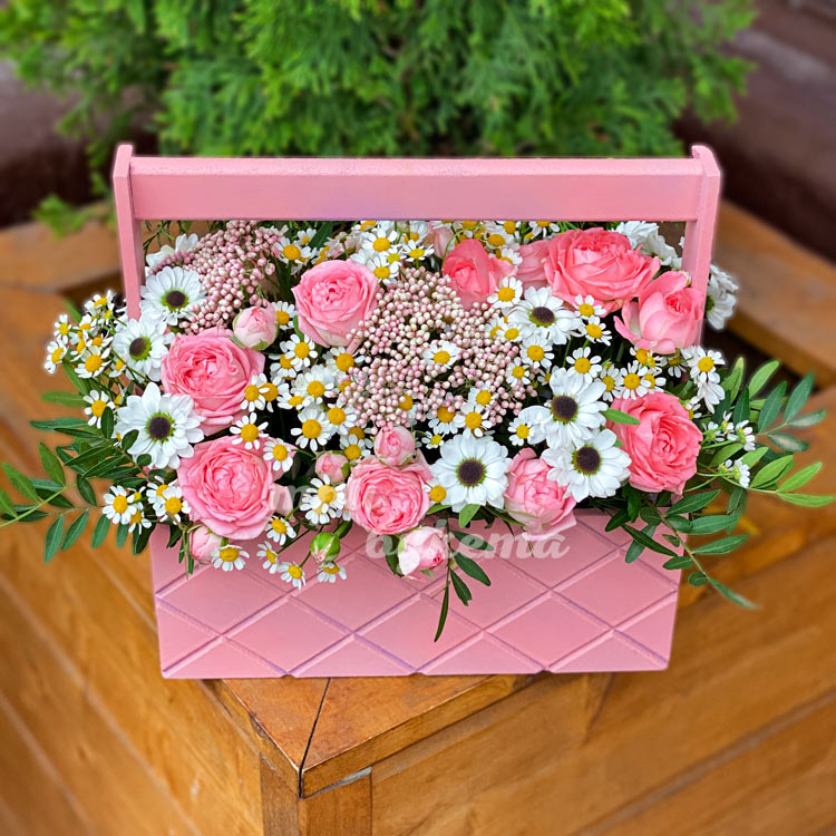 Ящик пионовидных роз и ромашек